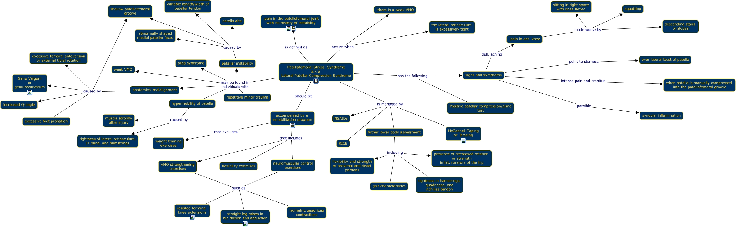 Patellofemoral SS, pain in ant. knee made worse by squatting, Patellafemoral Stress Syndrome a.k.a Lateral Patellar Compression Syndrome occurs when the lateral retinaculum is excessively tight, signs and symptoms possible synovial inflammation, patallar instability caused by patella alta, anatomical malalignment caused by Increased Q-angle, VMO strengthening exercises such as straight leg raises in hip flexion and adduction, neuromuscular control exercises such as straight leg raises in hip flexion and adduction, flexibility exercises such as isometric quadricep contractions, Patellafemoral Stress Syndrome a.k.a Lateral Patellar Compression Syndrome may be found in individuals with patallar instability, accompanied by a rehabilitation program that includes flexibility exercises