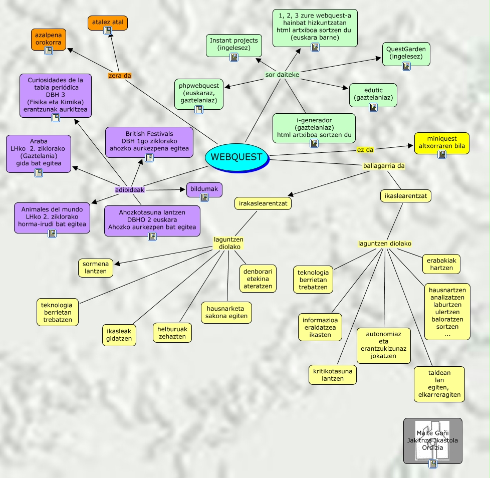 Webquestak, WEBQUEST sor daiteke 1, 2, 3 zure webquest-a hainbat hizkuntzatan html artxiboa sortzen du (euskara barne), ikaslearentzat laguntzen diolako informazioa eraldatzea ikasten, WEBQUEST adibideak bildumak, WEBQUEST sor daiteke QuestGarden (ingelesez), WEBQUEST baliagarria da ikaslearentzat, ikaslearentzat laguntzen diolako kritikotasuna lantzen, WEBQUEST sor daiteke Instant projects (ingelesez), ikaslearentzat laguntzen diolako autonomiaz eta erantzukizunaz jokatzen, irakaslearentzat laguntzen diolako helburuak zehazten, WEBQUEST sor daiteke edutic (gaztelaniaz)