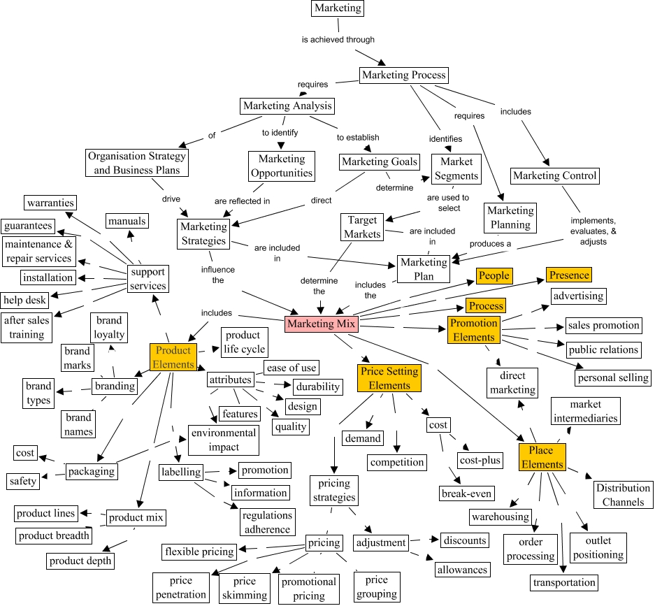 Marketing mix, attributes features, packaging safety, support services installation, support services after sales training, Organisation Strategy and Business Plans drive Marketing Strategies, Place Elements transportation, support services help desk, packaging environmental impact, support services manuals, Marketing Analysis to identify Marketing Opportunities