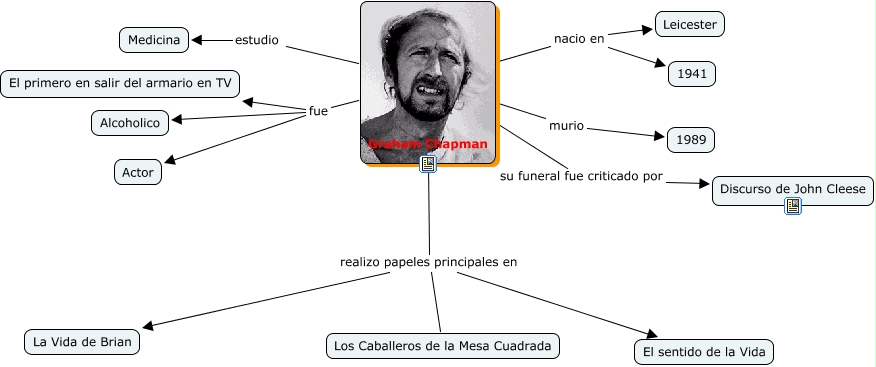 Graham Chapman, Graham Chapman nacio en Leicester, Graham Chapman realizo papeles principales en La Vida de Brian, Graham Chapman estudio Medicina, Graham Chapman realizo papeles principales en El sentido de la Vida, Graham Chapman su funeral fue criticado por Discurso de John Cleese, Graham Chapman fue El primero en salir del armario en TV, Graham Chapman fue Actor, Graham Chapman murio 1989, Graham Chapman realizo papeles principales en Los Caballeros de la Mesa Cuadrada, Graham Chapman fue Alcoholico