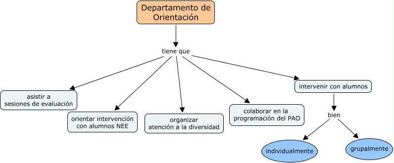 Orientación-Funciones, intervenir con alumnos bien individualmente, Departamento de Orientación tiene que intervenir con alumnos, Departamento de Orientación tiene que colaborar en la programación del PAO, Departamento de Orientación tiene que asistir a sesiones de evaluación, Departamento de Orientación tiene que organizar atención a la diversidad, Departamento de Orientación tiene que orientar intervención con alumnos NEE, intervenir con alumnos bien grupalmente