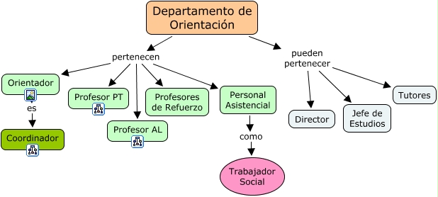 Orientación-Componentes, Departamento de Orientación pertenecen Profesor PT, Departamento de Orientación pueden pertenecer Director, Departamento de Orientación pueden pertenecer Jefe de Estudios, Personal Asistencial como Trabajador Social, Orientador es Coordinador, Departamento de Orientación pertenecen Profesores de Refuerzo, Departamento de Orientación pueden pertenecer Tutores, Departamento de Orientación pertenecen Profesor AL, Departamento de Orientación pertenecen Personal Asistencial, Departamento de Orientación pertenecen Orientador
