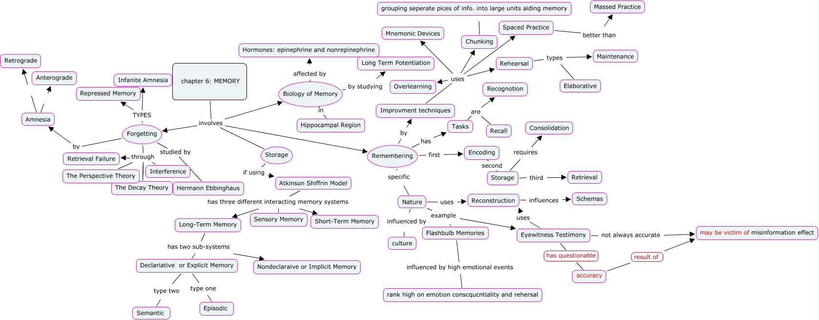 Chapter 6 Carmen Oliver, Improvment techniques uses Mnemonic Devices, Biology of Memory by studying Long Term Potentiation, Improvment techniques uses Chunking, Forgetting studied by Hermann Ebbinghaus, Atkinson Shiffrin Model has three different interacting memory systems Short-Term Memory, Forgetting through Interference, Improvment techniques uses Rehearsal, Eyewitness Testimony has questionable accuracy, Amnesia Anterograde, Declariative or Explicit Memory type one Episodic
