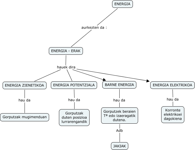 2C-Lande reta Matina, ENERGIA POTENTZIALA hau da Gorputzak duten posizioa lurrarengandik, ENERGIA - ERAK hauek dira BARNE ENERGIA, ENERGIA aurkezten da : ENERGIA - ERAK, Gorputzek beraien Tª edo izaeragatik dutena. Adb JAKIAK, ENERGIA - ERAK hauek dira ENERGIA ZIENETIKOA, BARNE ENERGIA hau da Gorputzek beraien Tª edo izaeragatik dutena., ENERGIA ZIENETIKOA hau da Gorputzak mugimenduan, ENERGIA - ERAK hauek dira ENERGIA POTENTZIALA, ENERGIA ELEKTRIKOA hau da Korronte elektrikoei dagokiena, ENERGIA - ERAK hauek dira ENERGIA ELEKTRIKOA