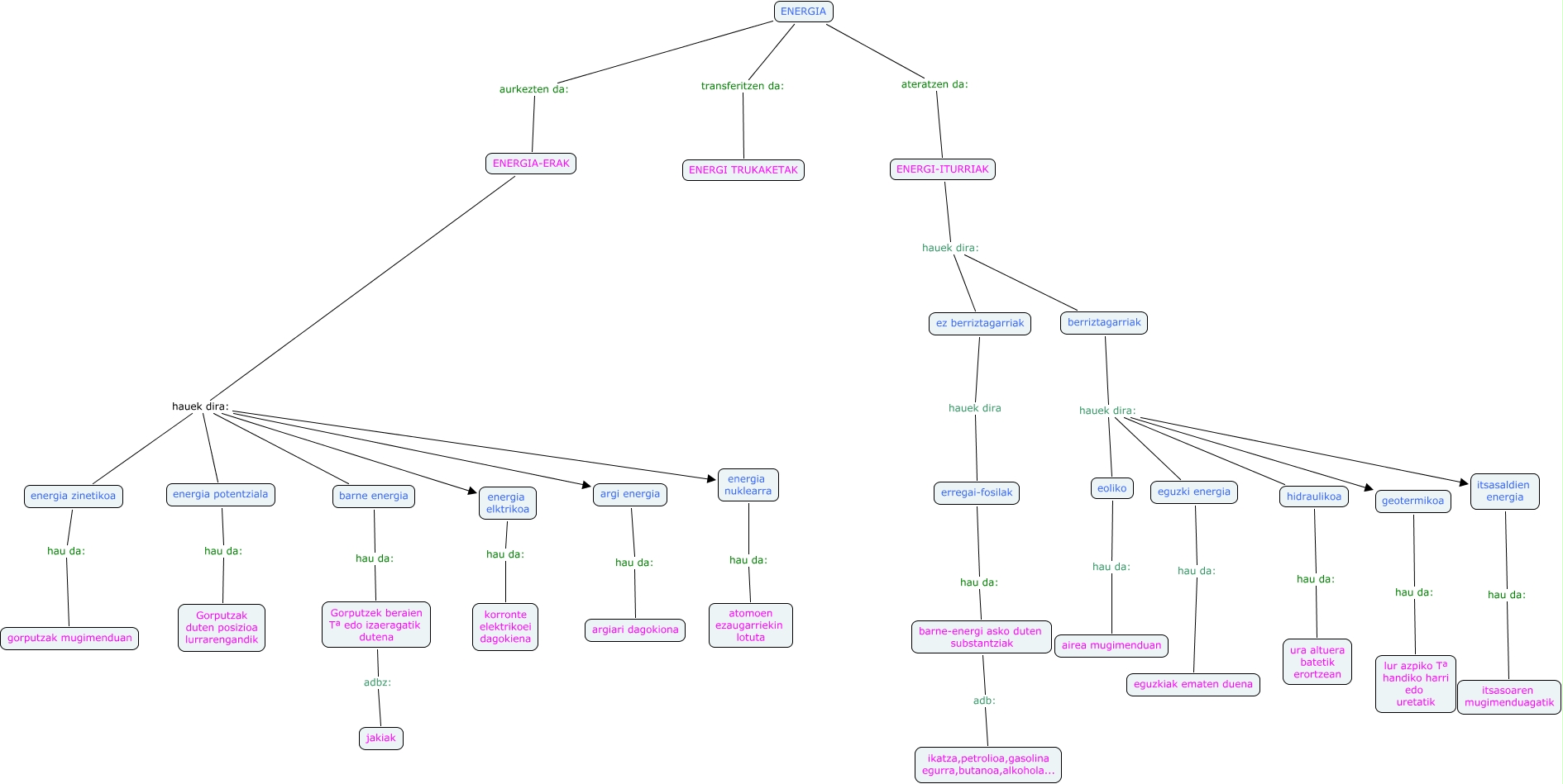 2C-janire-alba, energia potentziala hau da: Gorputzak duten posizioa lurrarengandik, itsasaldien energia hau da: itsasoaren mugimenduagatik, eguzki energia hau da: eguzkiak ematen duena, energia elktrikoa hau da: korronte elektrikoei dagokiena, eoliko hau da: airea mugimenduan, ENERGIA ateratzen da: ENERGI-ITURRIAK, berriztagarriak hauek dira: eguzki energia, berriztagarriak hauek dira: eoliko, ez berriztagarriak hauek dira erregai-fosilak, ENERGI-ITURRIAK hauek dira: ez berriztagarriak