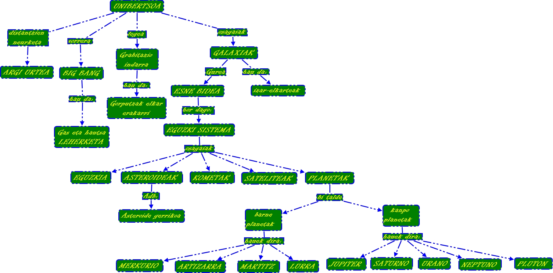 1B-itxaso, PLANETAK bi talde kanpo planetak, GALAXIAK hau da: izar-elkarteak, UNIBERTSOA distantzien neurketa ARGI URTEA, ASTEROIDEAK Adb: Asteroide gerrikoa, kanpo planetak hauek dira: PLUTON, GALAXIAK Gurea ESNE BIDEA, BIG BANG hau da: Gas eta hautsa LEHERKETA, barne planetak hauek dira: LURRA, kanpo planetak hauek dira: SATURNO, EGUZKI SISTEMA osagaiak ASTEROIDEAK