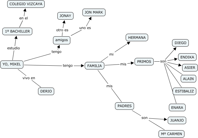 familia, 1º BACHILLER en el COLEGIO VIZCAYA, PRIMOS son DIEGO, PADRES son JUANJO, FAMILIA mis PADRES, PRIMOS son ENARA, PRIMOS son ALAIN, amigos uno es JON MARK, PRIMOS son ASIER, PRIMOS son ENDIKA, PADRES son Mº CARMEN