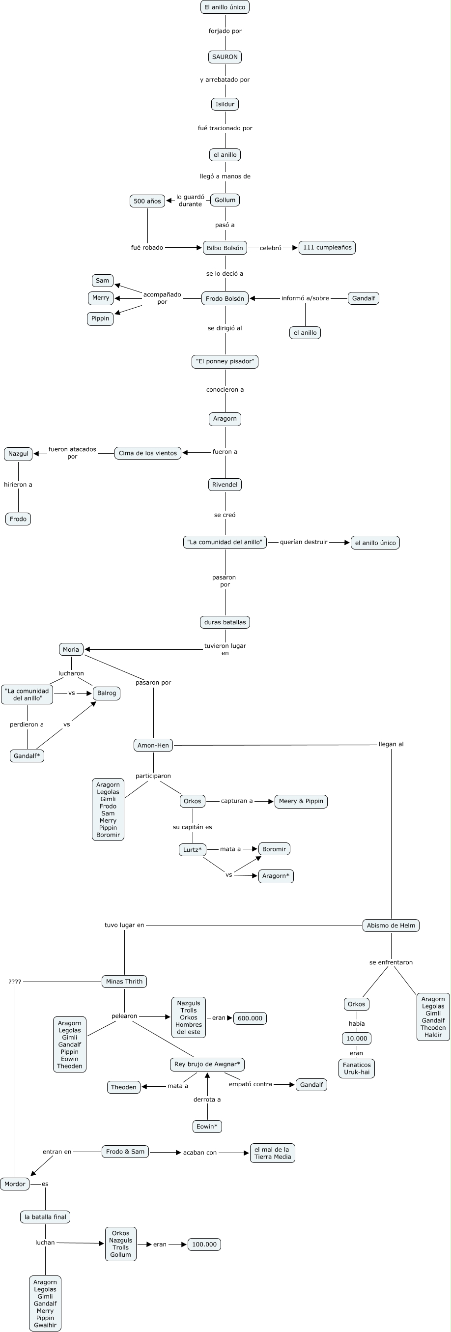 Argumento, Moria pasaron por Amon-Hen, Amon-Hen participaron Orkos, Mordor es la batalla final, Moria lucharon "La comunidad del anillo", Moria lucharon Balrog, Aragorn fueron a Rivendel, el anillo llegó a manos de Gollum, Minas Thrith pelearon Nazguls Trolls Orkos Hombres del este, Gandalf informó a/sobre el anillo, Amon-Hen participaron Aragorn Legolas Gimli Frodo Sam Merry Pippin Boromir