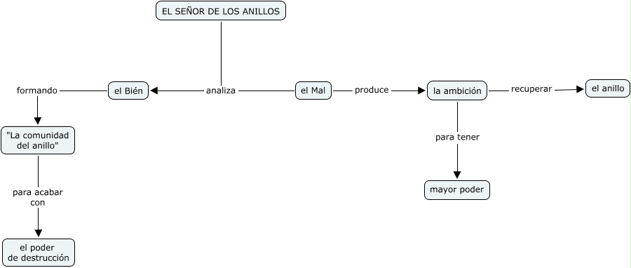 Tema, EL SEÑOR DE LOS ANILLOS analiza el Bién, "La comunidad del anillo" para acabar con el poder de destrucción, la ambición para tener mayor poder, el Mal analiza el Bién, la ambición recuperar el anillo, el Bién formando "La comunidad del anillo", el Mal produce la ambición