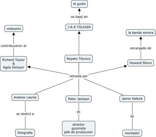 Reparto Técniko, Jamie Selkirk es montador, Repato Técnico relizada por J.R.R TOLKIEN, Andrew Lesnie se dedicó a fotografía, Howard Shore encargado de la banda sonora, Howard Shore encargado de la banda sonora, Peter Jackson es director guionista jefe de producción, Repato Técnico relizada por Jamie Selkirk, J.R.R TOLKIEN se basó en el guión, Repato Técnico relizada por Richard Taylor & Ngila Dickson, Repato Técnico relizada por Andrew Lesnie