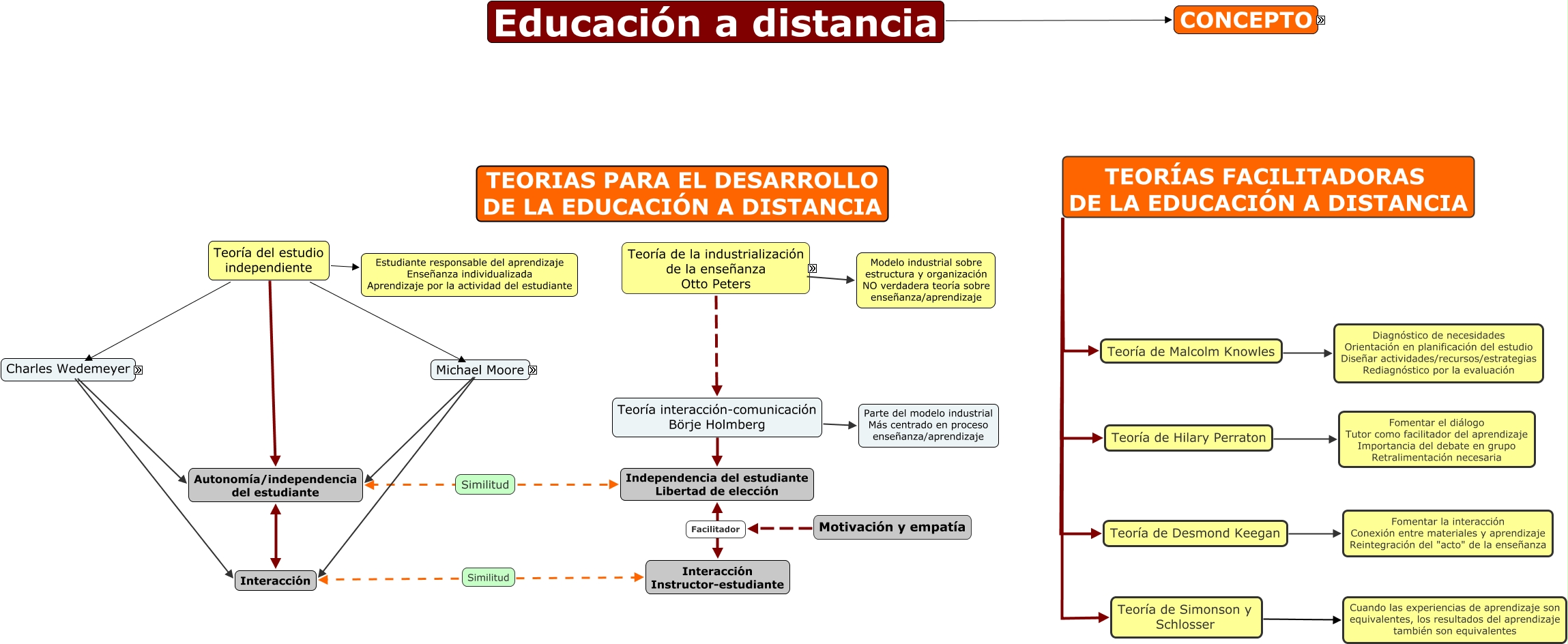 Teorias educación a distancia-intento modificar, Teoría de Desmond Keegan Fomentar la interacción Conexión entre materiales y aprendizaje Reintegración del "acto" de la enseñanza, Estudiante/s Sistema de Comunicación, Autonomía/independencia del estudiante Independencia del estudiante Libertad de elección, Teoría interacción-comunicación Börje Holmberg Independencia del estudiante Libertad de elección, Teoría de Malcolm Knowles Diagnóstico de necesidades Orientación en planificación del estudio Diseñar actividades/recursos/estrategias Rediagnóstico por la evaluación, Teoría interacción-comunicación Börje Holmberg Parte del modelo industrial Más centrado en proceso enseñanza/aprendizaje, Teoría de la industrialización de la enseñanza Otto Peters Teoría interacción-comunicación Börje Holmberg, TEORÍAS FACILITADORAS DE LA EDUCACIÓN A DISTANCIA Teoría de Malcolm Knowles, Teoría del estudio independiente Estudiante responsable del aprendizaje Enseñanza individualizada Aprendizaje por la actividad del estudiante, Motivación y empatía Facilitador