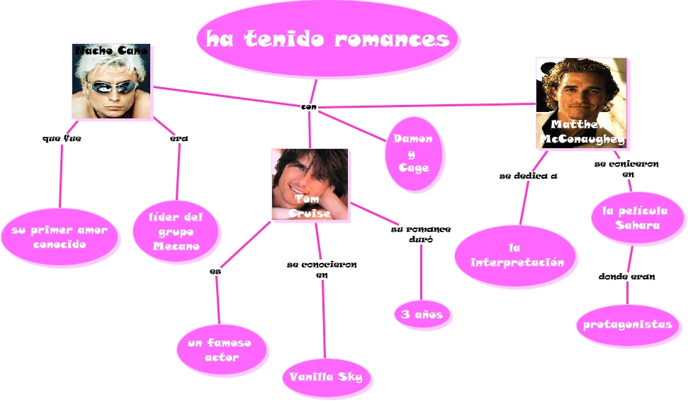amores pe, Matthew McConaughey se coniceron en la película Sahara, la película Sahara donde eran protagonistas, Matthew McConaughey se dedica a la interpretación, ha tenido romances con Nacho Cano, Nacho Cano era líder del grupo Mecano, Tom Cruise se conocieron en Vanilla Sky, ha tenido romances con Matthew McConaughey, ha tenido romances con Tom Cruise, Tom Cruise su romance duró 3 años, Nacho Cano que fue su primer amor conocido