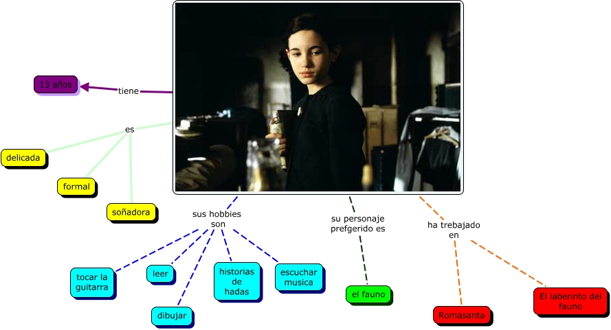 Ofelia, ???? sus hobbies son tocar la guitarra, ???? ha trebajado en Romasanta, ???? sus hobbies son leer, ???? tiene 13 años, ???? es soñadora, ???? sus hobbies son escuchar musica, ???? es delicada, ???? es formal, ???? su personaje prefgerido es el fauno, ???? ha trebajado en El laberinto del fauno