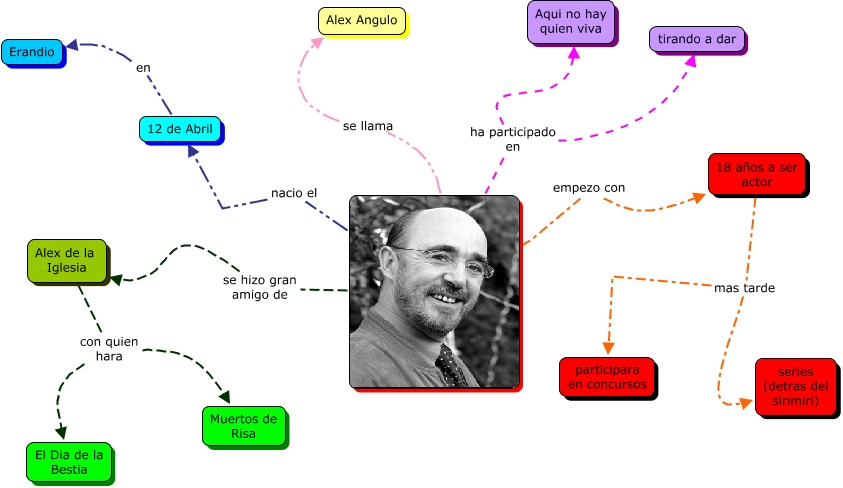 alex angulo, Alex de la Iglesia con quien hara Muertos de Risa, ha participado en tirando a dar, 18 años a ser actor mas tarde participara en concursos, 18 años a ser actor mas tarde series (detras del sirimiri), se hizo gran amigo de Alex de la Iglesia, empezo con 18 años a ser actor, Alex de la Iglesia con quien hara El Dia de la Bestia, nacio el 12 de Abril, ha participado en Aqui no hay quien viva, se llama Alex Angulo