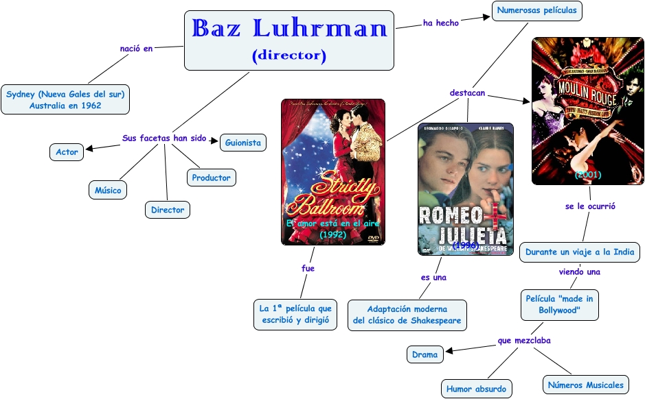 director, Baz Luhrman (director) Sus facetas han sido Director, Baz Luhrman (director) Sus facetas han sido Músico, Baz Luhrman (director) ha hecho Numerosas películas, (2001) se le ocurrió Durante un viaje a la India, Película "made in Bollywood" que mezclaba Humor absurdo, Baz Luhrman (director) Sus facetas han sido Guionista, Baz Luhrman (director) nació en Sydney (Nueva Gales del sur) Australia en 1962, Película "made in Bollywood" que mezclaba Drama, (1996) es una Adaptación moderna del clásico de Shakespeare, Durante un viaje a la India viendo una Película "made in Bollywood"