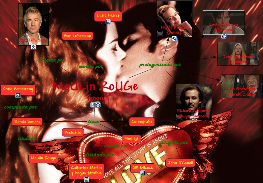 MoUlIn RoUgE 1, MoULin RoUGe (2001) tiene Banda Sonora, Montaje creado por Jill Bilcock, MoULin RoUGe (2001) protagonizada por John Leguizamo (Toulouse), MoULin RoUGe (2001) escrita por Craig Pearce, MoULin RoUGe (2001) protagonizada por Richard Roxburgh (Duque Monroth), MoULin RoUGe (2001) tiene Coreografía, Vestuario diseñado por Catherine Martin y Angus Strathie, MoULin RoUGe (2001) protagonizada por Nicole Kidman (Satine), MoULin RoUGe (2001) protagonizada por Jim Broadbent (Harold Zidler), Coreografía dirigida por John O'Conell