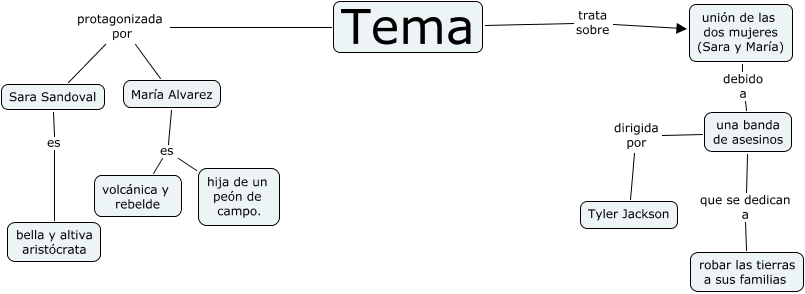 tema bandidas, una banda de asesinos que se dedican a robar las tierras a sus familias, unión de las dos mujeres (Sara y María) debido a una banda de asesinos, Tema trata sobre unión de las dos mujeres (Sara y María), María Alvarez es hija de un peón de campo., Sara Sandoval es bella y altiva aristócrata, María Alvarez es volcánica y rebelde, una banda de asesinos dirigida por Tyler Jackson, Tema protagonizada por Sara Sandoval, Tema protagonizada por María Alvarez