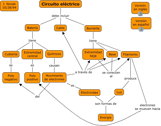 Circuito eléctrico, Extremidad baja se conectan al Filamento, Movimiento de electrones a través de Cable, Batería tiene Químicos, Circuito eléctrico debe incluir Cable, Batería tiene Cubierta, Bombilla tiene Base, Filamento produce Luz, Movimiento de electrones a través de Filamento, Cubierta es Polo negativo, Circuito eléctrico debe incluir Batería