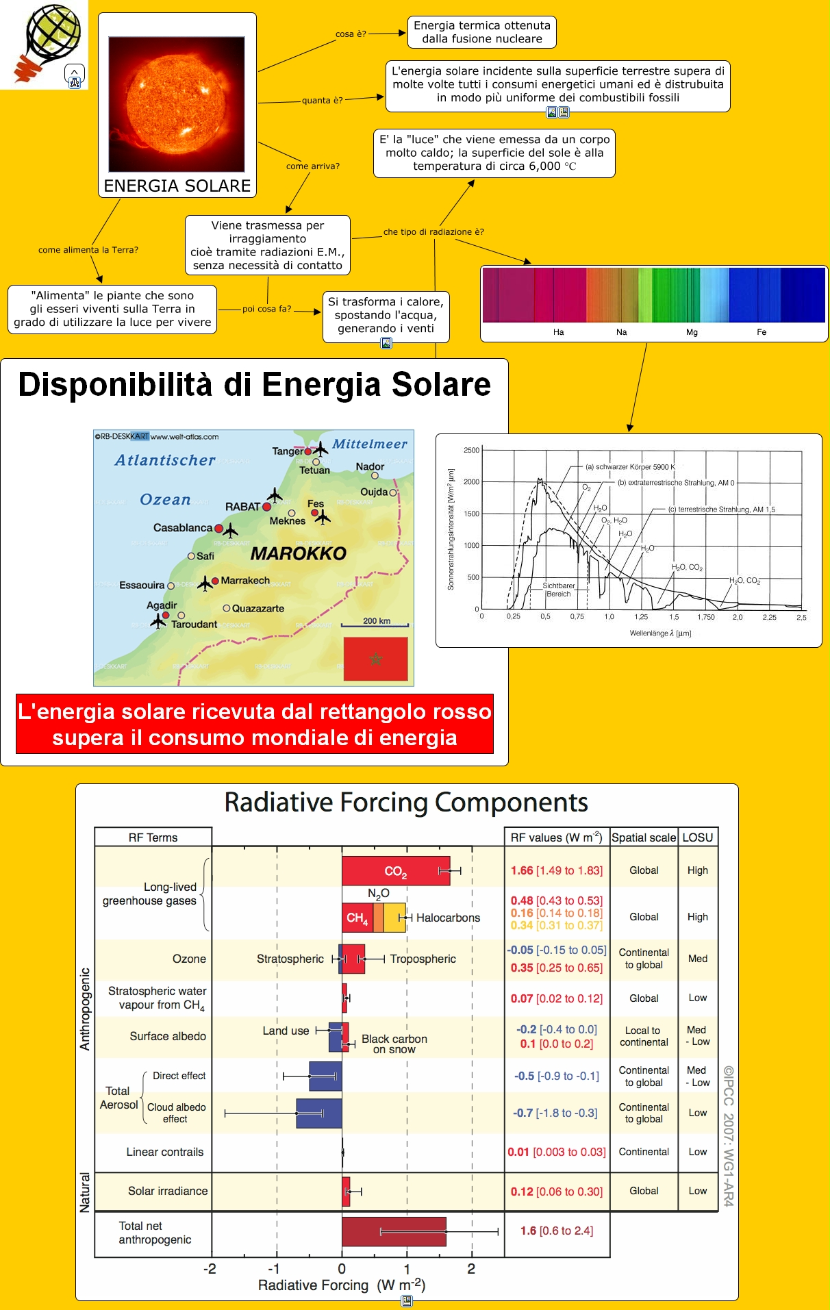 EnergiaSolare, Viene trasmessa per irraggiamento cioè tramite radiazioni E.M., senza necessità di contatto che tipo di radiazione è? , Viene trasmessa per irraggiamento cioè tramite radiazioni E.M., senza necessità di contatto che tipo di radiazione è? E' la "luce" che viene emessa da un corpo molto caldo; la superficie del sole è alla temperatura di circa 6,000 °C, ENERGIA SOLARE quanta è? L'energia solare incidente sulla superficie terrestre supera di molte volte tutti i consumi energetici umani ed è distrubuita in modo più uniforme dei combustibili fossili, Viene trasmessa per irraggiamento cioè tramite radiazioni E.M., senza necessità di contatto che tipo di radiazione è? , Viene trasmessa per irraggiamento cioè tramite radiazioni E.M., senza necessità di contatto poi cosa fa? Si trasforma i calore, spostando l'acqua, generando i venti, ENERGIA SOLARE come alimenta la Terra? "Alimenta" le piante che sono gli esseri viventi sulla Terra in grado di utilizzare la luce per vivere, "Alimenta" le piante che sono gli esseri viventi sulla Terra in grado di utilizzare la luce per vivere poi cosa fa? Si trasforma i calore, spostando l'acqua, generando i venti, ENERGIA SOLARE come arriva? Viene trasmessa per irraggiamento cioè tramite radiazioni E.M., senza necessità di contatto, ENERGIA SOLARE cosa è? Energia termica ottenuta dalla fusione nucleare,