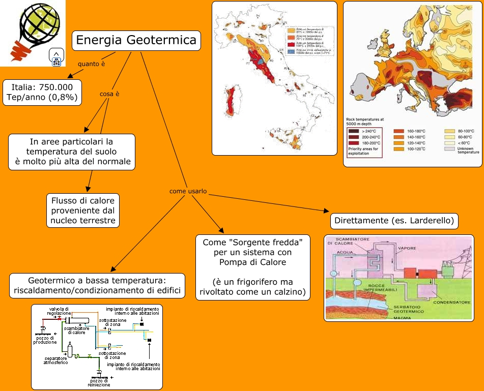 EnergiaGeotermica, Energia Geotermica cosa è Flusso di calore proveniente dal nucleo terrestre, Energia Geotermica come usarlo Geotermico a bassa temperatura: riscaldamento/condizionamento di edifici, Energia Geotermica quanto è Italia: 750.000 Tep/anno (0,8%), Energia Geotermica come usarlo Come "Sorgente fredda" per un sistema con Pompa di Calore (è un frigorifero ma rivoltato come un calzino), Energia Geotermica come usarlo Direttamente (es. Larderello), Energia Geotermica cosa è In aree particolari la temperatura del suolo è molto più alta del normale