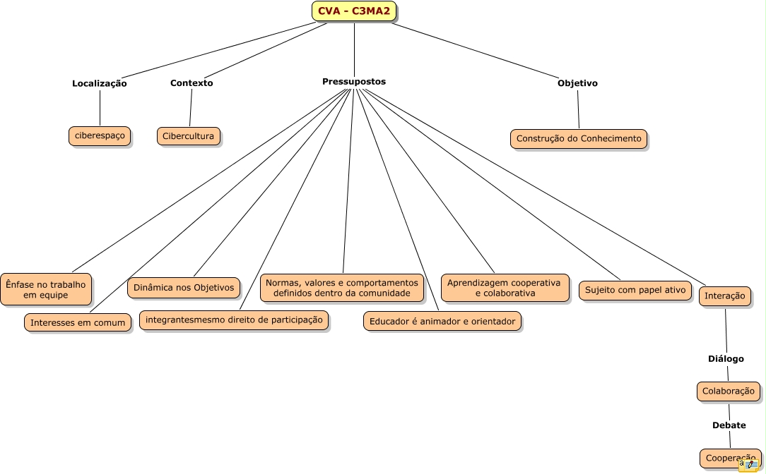 C3Ma2, CVA - C3MA2 Pressupostos Dinâmica nos Objetivos, CVA - C3MA2 Pressupostos Interesses em comum, CVA - C3MA2 Contexto Cibercultura, CVA - C3MA2 Pressupostos Normas, valores e comportamentos definidos dentro da comunidade, CVA - C3MA2 Pressupostos Educador é animador e orientador, CVA - C3MA2 Pressupostos Ênfase no trabalho em equipe, CVA - C3MA2 Pressupostos Sujeito com papel ativo, Colaboração Debate Cooperação, CVA - C3MA2 Objetivo Construção do Conhecimento, CVA - C3MA2 Pressupostos integrantesmesmo direito de participação