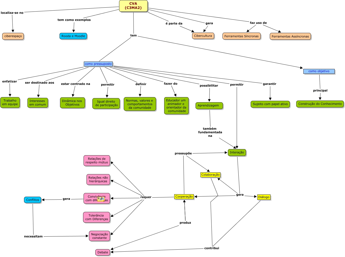 C3Ma2_V5, Colaboração contribui Debate, CVA (C3MA2) tem como objetivo, como pressuposto possibilitar Aprendizagem, Cooperação produz Debate, Cooperação requer Tolerância com Diferenças, como pressuposto permitir Igual direito de participação, Cooperação requer Relações não hierárquicas, Diálogo contribui Debate, Cooperação pressupõe Colaboração, Convivência com diferenças gera Conflitos