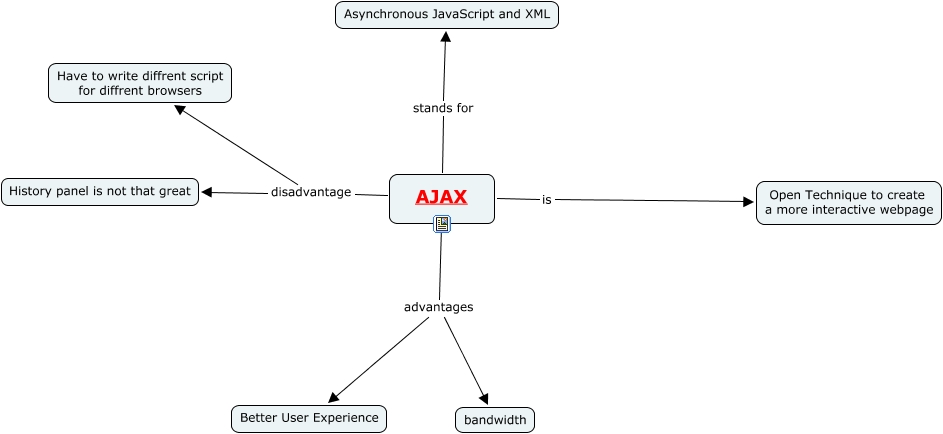 Eric's cmap, AJAX advantages Better User Experience, AJAX is Open Technique to create a more interactive webpage, AJAX stands for Asynchronous JavaScript and XML, AJAX disadvantage Have to write diffrent script for diffrent browsers, AJAX advantages bandwidth, AJAX disadvantage History panel is not that great