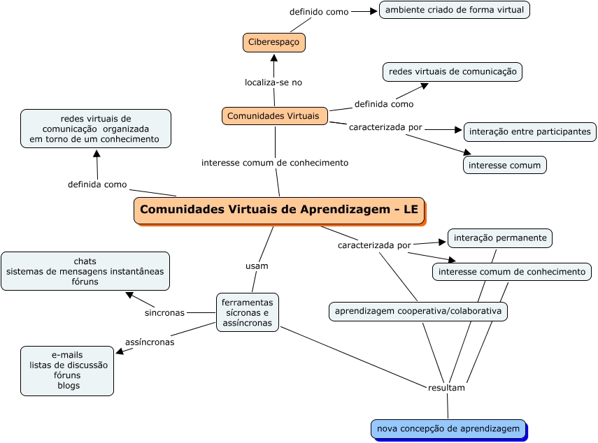 CVA, Ciberespaço definido como ambiente criado de forma virtual, ferramentas sícronas e assíncronas assíncronas e-mails listas de discussão fóruns blogs, Comunidades Virtuais de Aprendizagem - LE usam ferramentas sícronas e assíncronas, Comunidades Virtuais caracterizada por interação entre participantes, Comunidades Virtuais interesse comum de conhecimento Comunidades Virtuais de Aprendizagem - LE, Comunidades Virtuais de Aprendizagem - LE caracterizada por aprendizagem cooperativa/colaborativa, Comunidades Virtuais de Aprendizagem - LE caracterizada por interação permanente, Comunidades Virtuais caracterizada por interação entre participantes, ferramentas sícronas e assíncronas resultam nova concepção de aprendizagem, Comunidades Virtuais localiza-se no Ciberespaço