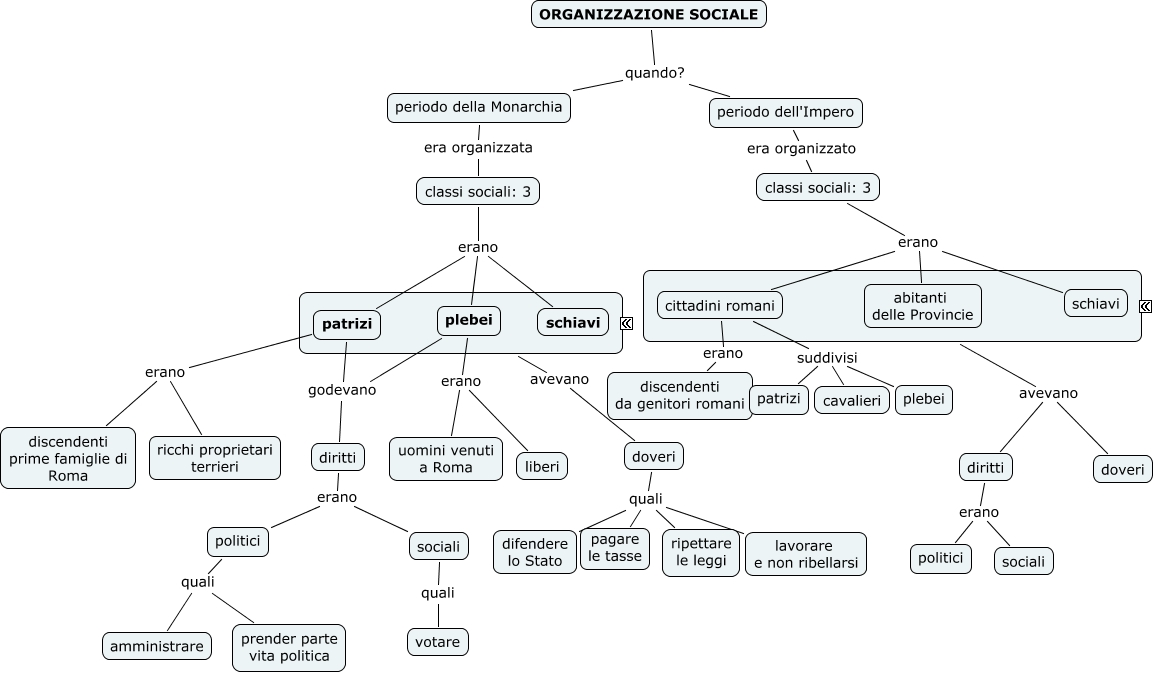 organiz. sociale, patrizi godevano diritti, periodo della Monarchia era organizzata classi sociali: 3, diritti erano politici, ???? avevano doveri, classi sociali: 3 erano cittadini romani, cittadini romani erano discendenti da genitori romani, plebei erano liberi, ???? avevano diritti, classi sociali: 3 erano abitanti delle Provincie, doveri quali lavorare e non ribellarsi