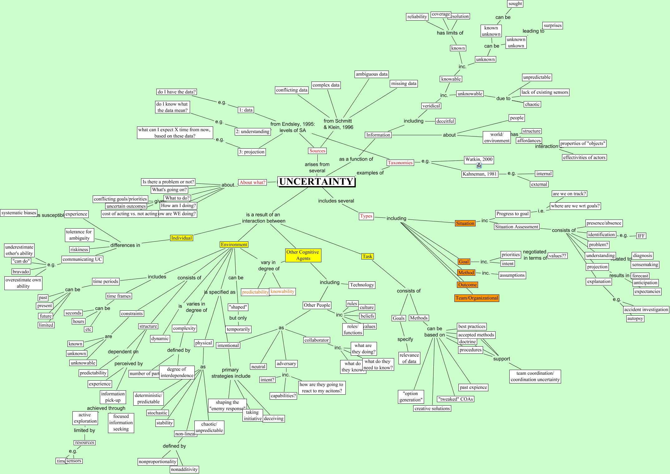 Uncertainty, Types including Team/Organizational, physical as chaotic/ unpredictable, Taxonomies e.g. Kahneman, 1981, doctrine support team coordination/ coordination uncertainty, Situation Assessment consists of explanation, UNCERTAINTY is a result of an interaction between Individual, physical as stability, Kahneman, 1981 e.g. internal, chaotic due to unpredictable, priorities negotiated in terms of values??