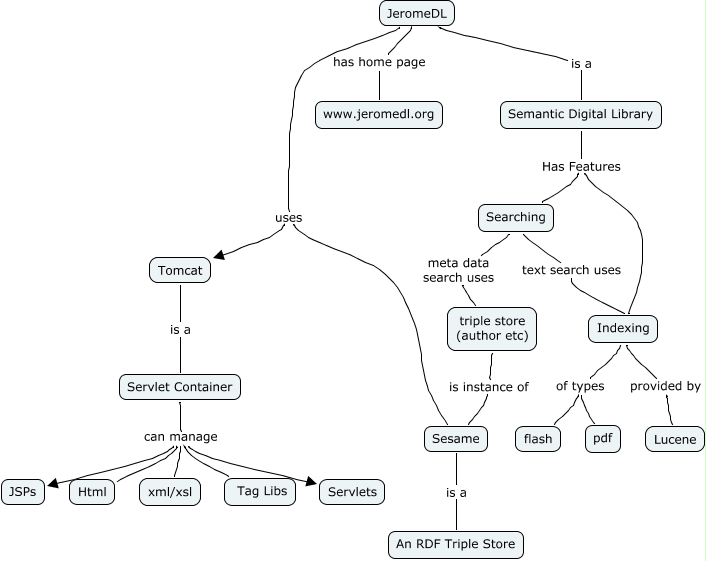 JDL-01, Searching text search uses Indexing, Servlet Container can manage xml/xsl, Tomcat is a Servlet Container, Semantic Digital Library Has Features Indexing, JeromeDL has home page www.jeromedl.org, Semantic Digital Library Has Features Searching, Servlet Container can manage Tag Libs, Indexing provided by Lucene, Servlet Container can manage JSPs, Sesame is a An RDF Triple Store