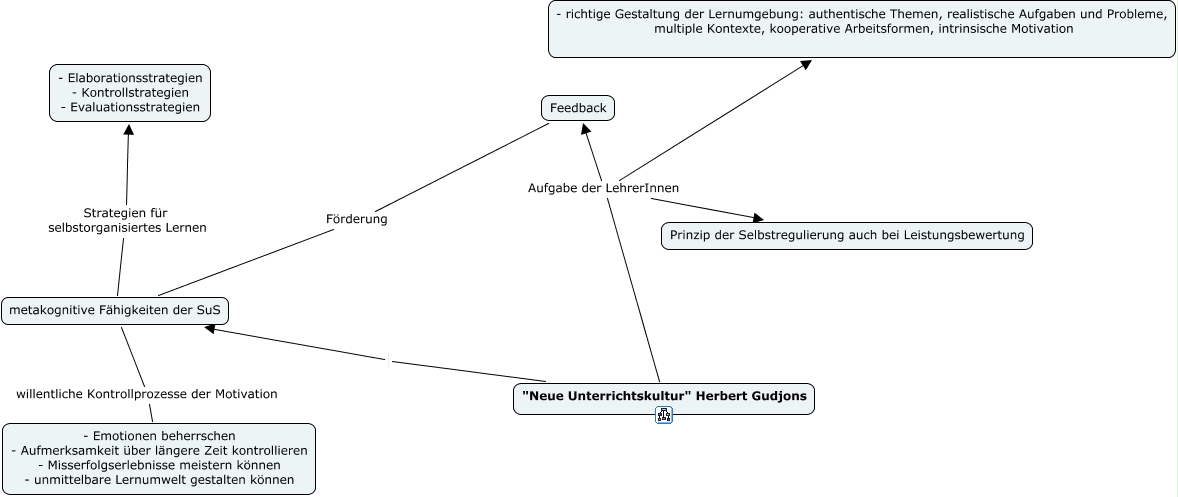 Neue Unterrichtskultur, "Neue Unterrichtskultur" Herbert Gudjons metakognitive Fähigkeiten der SuS, metakognitive Fähigkeiten der SuS willentliche Kontrollprozesse der Motivation - Emotionen beherrschen - Aufmerksamkeit über längere Zeit kontrollieren - Misserfolgserlebnisse meistern können - unmittelbare Lernumwelt gestalten können, "Neue Unterrichtskultur" Herbert Gudjons Aufgabe der LehrerInnen Prinzip der Selbstregulierung auch bei Leistungsbewertung, metakognitive Fähigkeiten der SuS Strategien für selbstorganisiertes Lernen - Elaborationsstrategien - Kontrollstrategien - Evaluationsstrategien, "Neue Unterrichtskultur" Herbert Gudjons Aufgabe der LehrerInnen Feedback, Feedback Förderung metakognitive Fähigkeiten der SuS, "Neue Unterrichtskultur" Herbert Gudjons Aufgabe der LehrerInnen - richtige Gestaltung der Lernumgebung: authentische Themen, realistische Aufgaben und Probleme, multiple Kontexte, kooperative Arbeitsformen, intrinsische Motivation