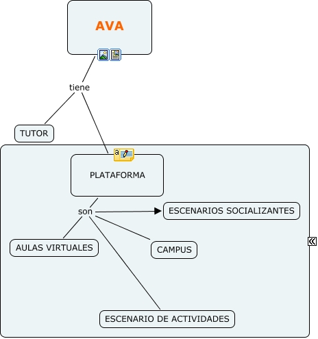 AVA, PLATAFORMA son ESCENARIO DE ACTIVIDADES, AVA tiene TUTOR, PLATAFORMA son CAMPUS, PLATAFORMA son ESCENARIOS SOCIALIZANTES, AVA tiene PLATAFORMA, PLATAFORMA son AULAS VIRTUALES