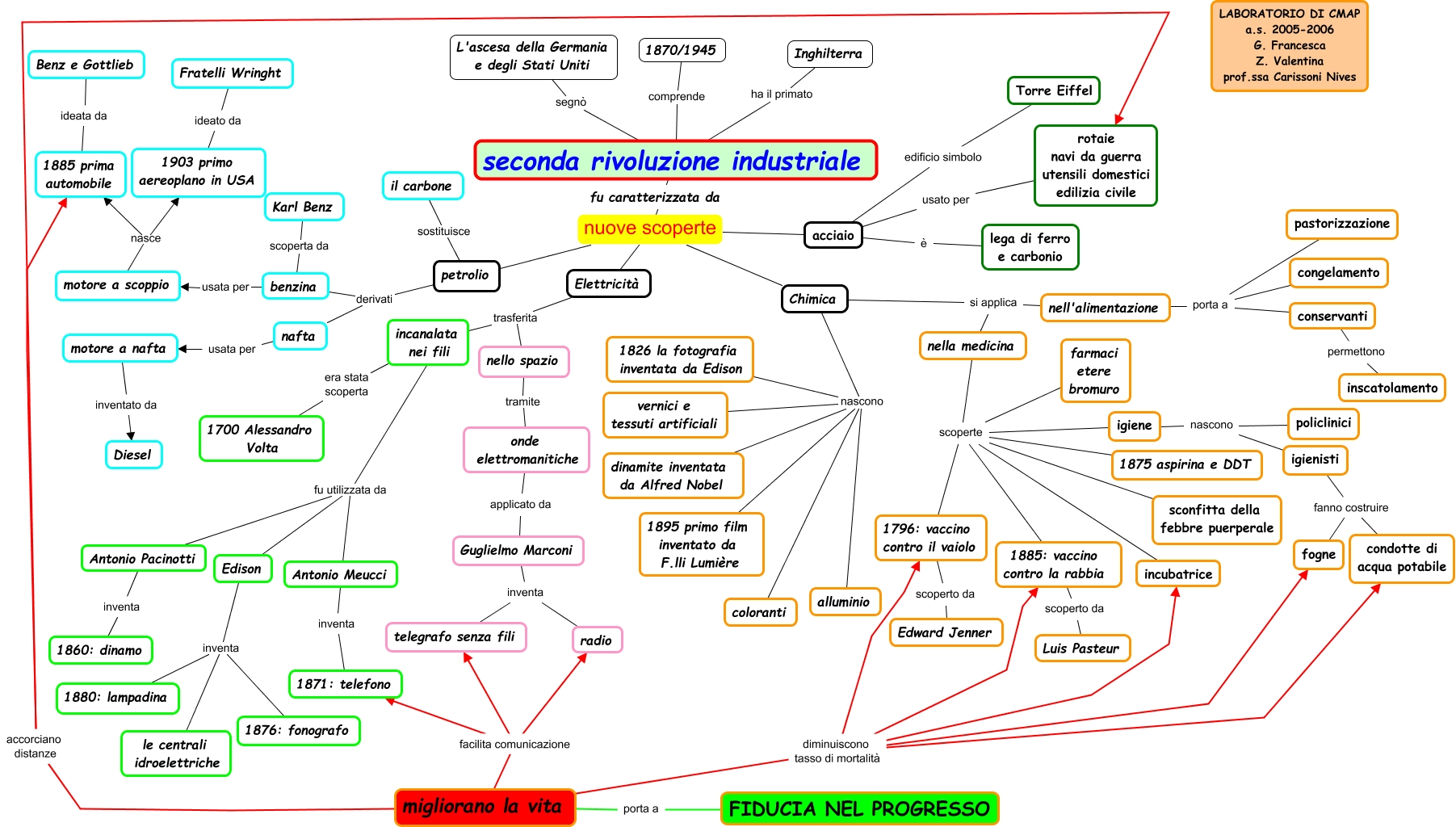 Questa Cmap, creata con IHMC CmapTools, contiene informazioni relative a: seconda rivoluzione industriale, seconda rivoluzione industriale nuove scoperte acciaio, motore a scoppio nasce 1903 primo aereoplano in USA, seconda rivoluzione industriale nuove scoperte Chimica, 1885: vaccino contro la rabbia scoperto da Luis Pasteur, Chimica nascono coloranti, Chimica si applica nella medicina, migliorano la vita accorciano distanze rotaie navi da guerra utensili domestici edilizia civile, nella medicina scoperte igiene, nella medicina scoperte 1875 aspirina e DDT, Antonio Meucci inventa 1871: telefono, migliorano la vita diminuiscono tasso di mortalità incubatrice, nella medicina scoperte 1796: vaccino contro il vaiolo, migliorano la vita porta a FIDUCIA NEL PROGRESSO, incanalata nei fili fu utilizzata da Edison, seconda rivoluzione industriale ha il primato Inghilterra, migliorano la vita facilita comunicazione 1871: telefono, igiene nascono policlinici, motore a scoppio nasce 1885 prima automobile, benzina scoperta da Karl Benz, Chimica si applica nell'alimentazione
