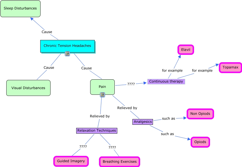 CTH CMap, Chronic Tension Headaches Cause Visual Disturbances, Chronic Tension Headaches Cause Sleep Disturbances, Chronic Tension Headaches Cause Pain, Continuous therapy for example Elavil, Pain Relieved by Relaxation Techniques, Pain Relieved by Analgesics, Relaxation Techniques ???? Breathing Exercises, Analgesics such as Opiods, Analgesics such as Non Opiods, Continuous therapy for example Topamax