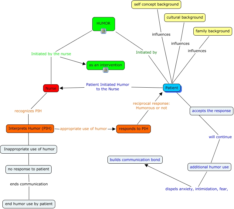 This Concept Map has information related to: PIH Humor, Nurse recognizes PIH no response to patient, responds to PIH reciprocal response: Humorous or not Patient, family background influences Patient, HUMOR Initiated by the nurse Nurse, additional humor use dispels anxiety, intimidation, fear, builds communication bond, end humor use by patient ends communication no response to patient, Patient Patient Initiated Humor to the Nurse Nurse, cultural background influences Patient, Patient will continue additional humor use, Interprets Humor (PIH) appropriate use of humor responds to PIH
