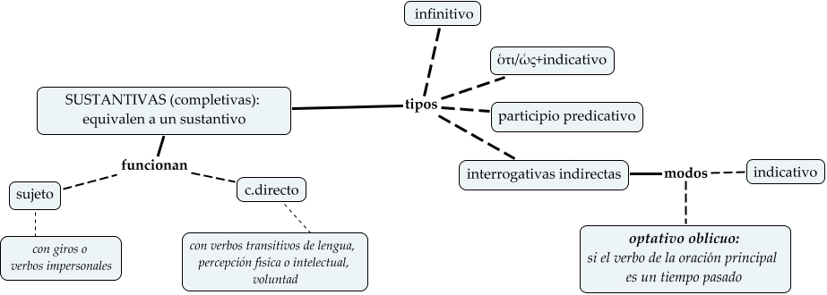 sustantivas, sujeto funcionan SUSTANTIVAS (completivas): equivalen a un sustantivo, interrogativas indirectas modos indicativo, sujeto ???? con giros o verbos impersonales, SUSTANTIVAS (completivas): equivalen a un sustantivo tipos interrogativas indirectas, SUSTANTIVAS (completivas): equivalen a un sustantivo tipos participio predicativo, sujeto funcionan SUSTANTIVAS (completivas): equivalen a un sustantivo, sujeto funcionan c.directo, SUSTANTIVAS (completivas): equivalen a un sustantivo tipos ὁτι/ὡς+indicativo, SUSTANTIVAS (completivas): equivalen a un sustantivo tipos infinitivo, interrogativas indirectas modos optativo oblicuo: si el verbo de la oración principal es un tiempo pasado