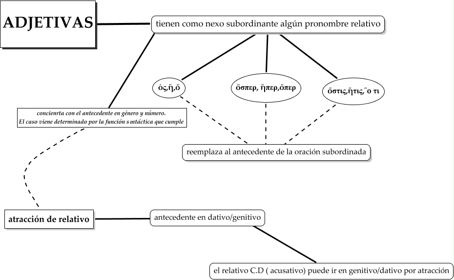 adjetivas, ὁς,ἥ,ὅ ???? tienen como nexo subordinante algún pronombre relativo, concienrta con el antecedente en género y número. El caso viene determinado por la función sιntáctica que cumple ???? atracción de relativo, concienrta con el antecedente en género y número. El caso viene determinado por la función sιntáctica que cumple ???? tienen como nexo subordinante algún pronombre relativo, ADJETIVAS ???? tienen como nexo subordinante algún pronombre relativo, ὅσπερ, ἥπερ,ὅπερ ???? tienen como nexo subordinante algún pronombre relativo, ὅστις,ἥτις,῞o τι ???? tienen como nexo subordinante algún pronombre relativo, ὅστις,ἥτις,῞o τι ???? reemplaza al antecedente de la oración subordinada, reemplaza al antecedente de la oración subordinada ???? ὅσπερ, ἥπερ,ὅπερ, el relativo C.D ( acusativo) puede ir en genitivo/dativo por atracción ???? antecedente en dativo/genitivo, reemplaza al antecedente de la oración subordinada ???? ὁς,ἥ,ὅ