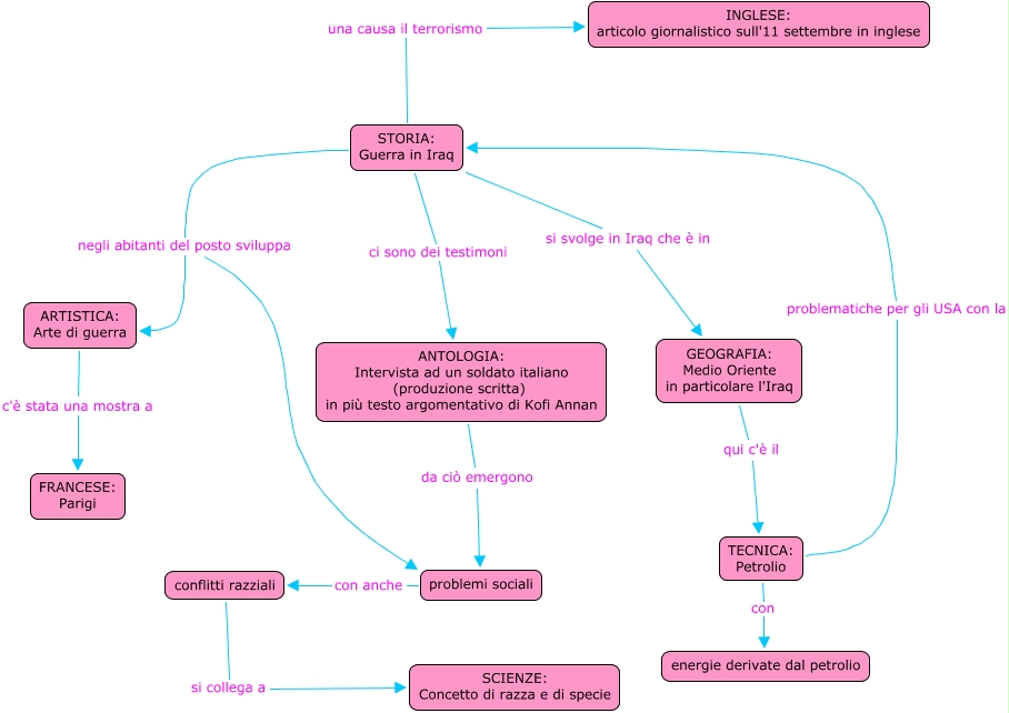 programma d'esame, STORIA: Guerra in Iraq negli abitanti del posto sviluppa ARTISTICA: Arte di guerra, TECNICA: Petrolio con energie derivate dal petrolio, STORIA: Guerra in Iraq ci sono dei testimoni ANTOLOGIA: Intervista ad un soldato italiano (produzione scritta) in più testo argomentativo di Kofi Annan, ANTOLOGIA: Intervista ad un soldato italiano (produzione scritta) in più testo argomentativo di Kofi Annan da ciò emergono problemi sociali, STORIA: Guerra in Iraq negli abitanti del posto sviluppa problemi sociali, STORIA: Guerra in Iraq si svolge in Iraq che è in GEOGRAFIA: Medio Oriente in particolare l'Iraq, STORIA: Guerra in Iraq una causa il terrorismo INGLESE: articolo giornalistico sull'11 settembre in inglese, ARTISTICA: Arte di guerra c'è stata una mostra a FRANCESE: Parigi, GEOGRAFIA: Medio Oriente in particolare l'Iraq qui c'è il TECNICA: Petrolio, TECNICA: Petrolio problematiche per gli USA con la STORIA: Guerra in Iraq