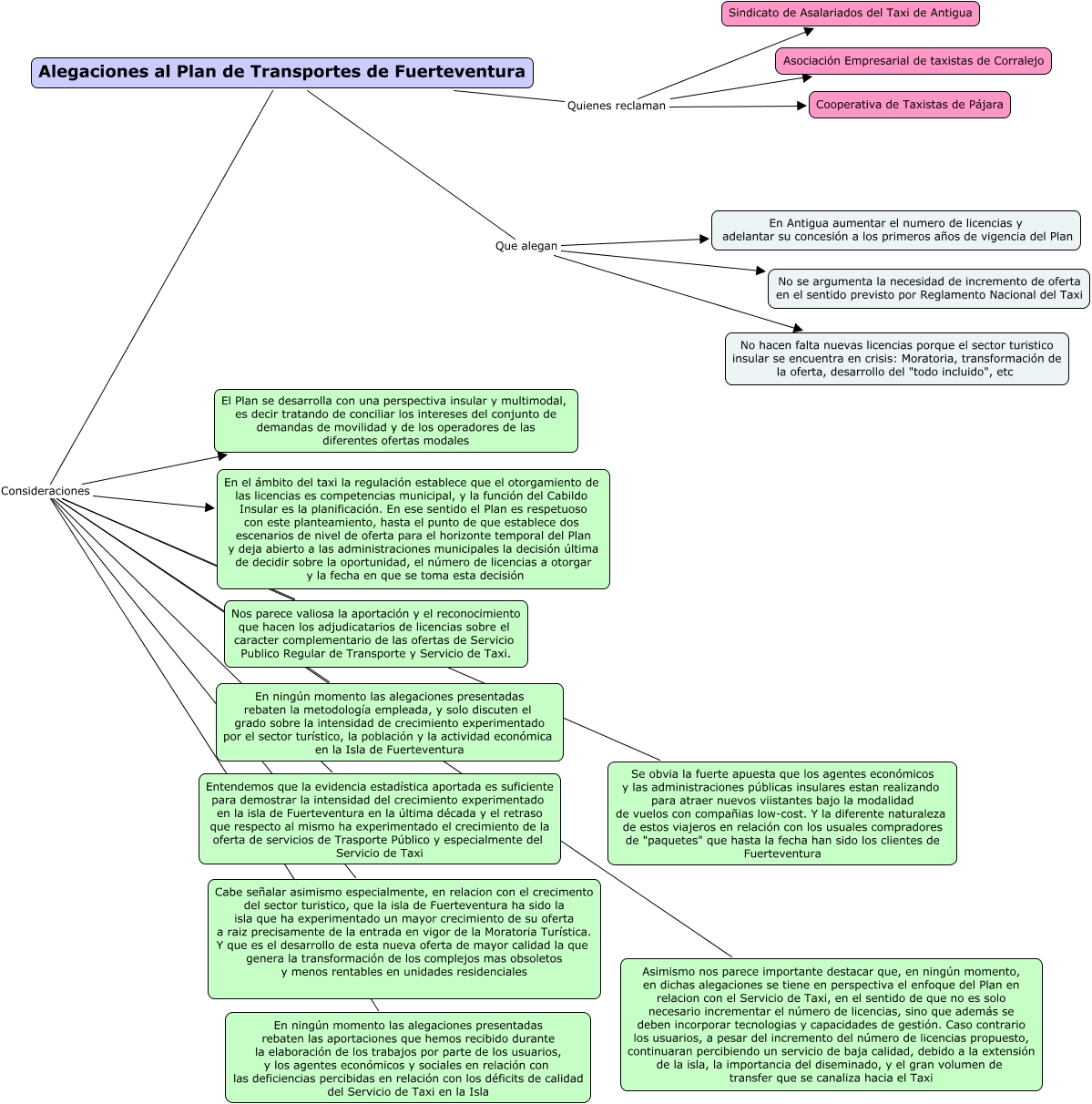 Alegaciones PT Fuerteventura, Alegaciones al Plan de Transportes de Fuerteventura Consideraciones Cabe señalar asimismo especialmente, en relacion con el crecimento del sector turistico, que la isla de Fuerteventura ha sido la isla que ha experimentado un mayor crecimiento de su oferta a raiz precisamente de la entrada en vigor de la Moratoria Turística. Y que es el desarrollo de esta nueva oferta de mayor calidad la que genera la transformación de los complejos mas obsoletos y menos rentables en unidades residenciales, Alegaciones al Plan de Transportes de Fuerteventura Que alegan En Antigua aumentar el numero de licencias y adelantar su concesión a los primeros años de vigencia del Plan, Alegaciones al Plan de Transportes de Fuerteventura Quienes reclaman Sindicato de Asalariados del Taxi de Antigua, Alegaciones al Plan de Transportes de Fuerteventura Consideraciones El Plan se desarrolla con una perspectiva insular y multimodal, es decir tratando de conciliar los intereses del conjunto de demandas de movilidad y de los operadores de las diferentes ofertas modales, Alegaciones al Plan de Transportes de Fuerteventura Consideraciones Asimismo nos parece importante destacar que, en ningún momento, en dichas alegaciones se tiene en perspectiva el enfoque del Plan en relacion con el Servicio de Taxi, en el sentido de que no es solo necesario incrementar el número de licencias, sino que además se deben incorporar tecnologias y capacidades de gestión. Caso contrario los usuarios, a pesar del incremento del número de licencias propuesto, continuaran percibiendo un servicio de baja calidad, debido a la extensión de la isla, la importancia del diseminado, y el gran volumen de transfer que se canaliza hacia el Taxi, Alegaciones al Plan de Transportes de Fuerteventura Consideraciones En ningún momento las alegaciones presentadas rebaten la metodología empleada, y solo discuten el grado sobre la intensidad de crecimiento experimentado por el sector turístico, la población y la actividad económica en la Isla de Fuerteventura, Alegaciones al Plan de Transportes de Fuerteventura Consideraciones En el ámbito del taxi la regulación establece que el otorgamiento de las licencias es competencias municipal, y la función del Cabildo Insular es la planificación. En ese sentido el Plan es respetuoso con este planteamiento, hasta el punto de que establece dos escenarios de nivel de oferta para el horizonte temporal del Plan y deja abierto a las administraciones municipales la decisión última de decidir sobre la oportunidad, el número de licencias a otorgar y la fecha en que se toma esta decisión, Alegaciones al Plan de Transportes de Fuerteventura Consideraciones Entendemos que la evidencia estadística aportada es suficiente para demostrar la intensidad del crecimiento experimentado en la isla de Fuerteventura en la última década y el retraso que respecto al mismo ha experimentado el crecimiento de la oferta de servicios de Trasporte Público y especialmente del Servicio de Taxi, Alegaciones al Plan de Transportes de Fuerteventura Que alegan No hacen falta nuevas licencias porque el sector turistico insular se encuentra en crisis: Moratoria, transformación de la oferta, desarrollo del "todo incluido", etc, Alegaciones al Plan de Transportes de Fuerteventura Consideraciones En ningún momento las alegaciones presentadas rebaten las aportaciones que hemos recibido durante la elaboración de los trabajos por parte de los usuarios, y los agentes económicos y sociales en relación con las deficiencias percibidas en relación con los déficits de calidad del Servicio de Taxi en la Isla