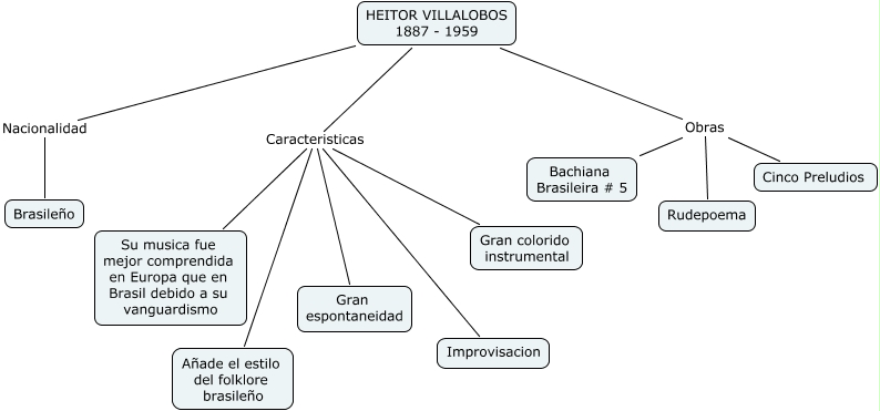 Villalobos, HEITOR VILLALOBOS 1887 - 1959 Nacionalidad Brasileño, HEITOR VILLALOBOS 1887 - 1959 Caracteristicas Su musica fue mejor comprendida en Europa que en Brasil debido a su vanguardismo, HEITOR VILLALOBOS 1887 - 1959 Obras Bachiana Brasileira # 5, HEITOR VILLALOBOS 1887 - 1959 Caracteristicas Gran colorido instrumental, HEITOR VILLALOBOS 1887 - 1959 Obras Cinco Preludios, HEITOR VILLALOBOS 1887 - 1959 Obras Rudepoema, HEITOR VILLALOBOS 1887 - 1959 Caracteristicas Gran espontaneidad, HEITOR VILLALOBOS 1887 - 1959 Caracteristicas Añade el estilo del folklore brasileño, HEITOR VILLALOBOS 1887 - 1959 Caracteristicas Improvisacion