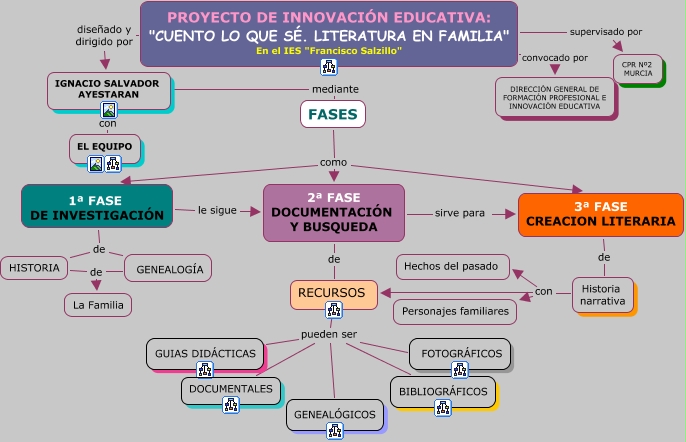 fasesproyecto, Historia narrativa con RECURSOS, IGNACIO SALVADOR AYESTARAN con EL EQUIPO, 2ª FASE DOCUMENTACIÓN Y BUSQUEDA de RECURSOS, 3ª FASE CREACION LITERARIA de Historia narrativa, RECURSOS pueden ser GUIAS DIDÁCTICAS, RECURSOS pueden ser FOTOGRÁFICOS, 1ª FASE DE INVESTIGACIÓN de HISTORIA, PROYECTO DE INNOVACIÓN EDUCATIVA: "CUENTO LO QUE SÉ. LITERATURA EN FAMILIA" En el IES "Francisco Salzillo" convocado por DIRECCIÓN GENERAL DE FORMACIÓN PROFESIONAL E INNOVACIÓN EDUCATIVA, 1ª FASE DE INVESTIGACIÓN le sigue 2ª FASE DOCUMENTACIÓN Y BUSQUEDA, 1ª FASE DE INVESTIGACIÓN de GENEALOGÍA