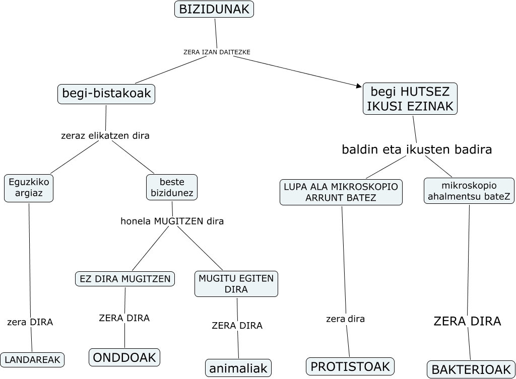 QUINTANA, MUGITU EGITEN DIRA ZERA DIRA animaliak, BIZIDUNAK ZERA IZAN DAITEZKE begi HUTSEZ IKUSI EZINAK, begi HUTSEZ IKUSI EZINAK baldin eta ikusten badira LUPA ALA MIKROSKOPIO ARRUNT BATEZ, LUPA ALA MIKROSKOPIO ARRUNT BATEZ zera dira PROTISTOAK, begi HUTSEZ IKUSI EZINAK baldin eta ikusten badira mikroskopio ahalmentsu bateZ, begi-bistakoak zeraz elikatzen dira beste bizidunez, beste bizidunez honela MUGITZEN dira EZ DIRA MUGITZEN, Eguzkiko argiaz zera DIRA LANDAREAK, begi-bistakoak zeraz elikatzen dira Eguzkiko argiaz, EZ DIRA MUGITZEN ZERA DIRA ONDDOAK