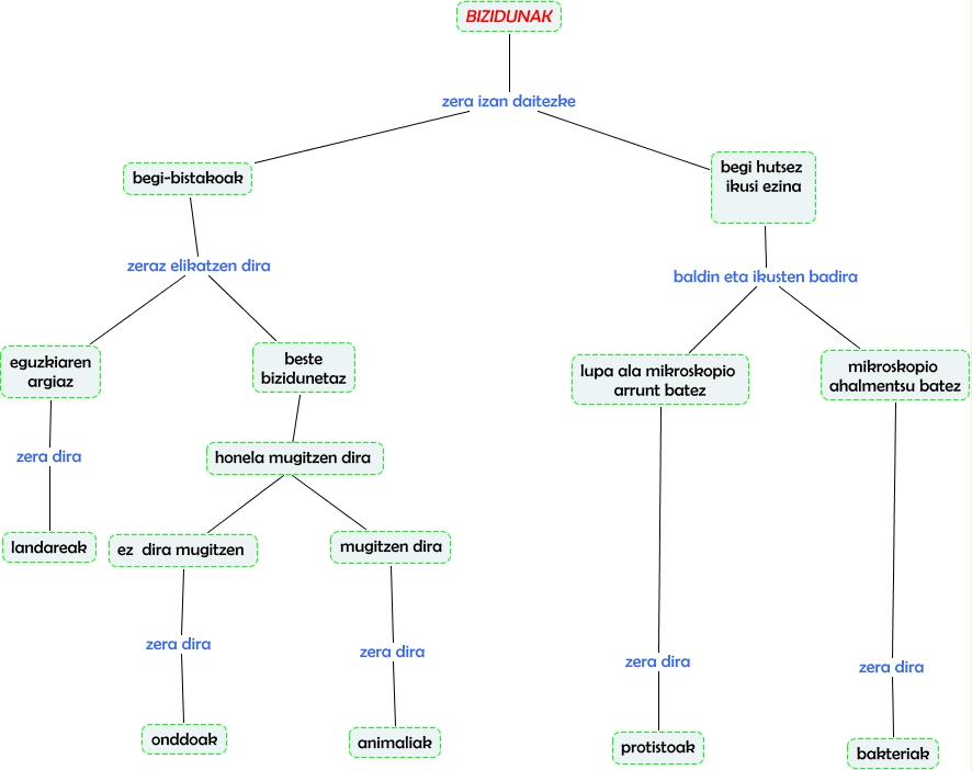 patri y jaio, BIZIDUNAK zera izan daitezke begi-bistakoak, lupa ala mikroskopio arrunt batez zera dira protistoak, begi-bistakoak zeraz elikatzen dira beste bizidunetaz, ez dira mugitzen zera dira onddoak, mikroskopio ahalmentsu batez zera dira bakteriak, mugitzen dira zera dira animaliak, eguzkiaren argiaz zera dira landareak, begi hutsez ikusi ezina baldin eta ikusten badira lupa ala mikroskopio arrunt batez, beste bizidunetaz mugitzen dira, begi-bistakoak zeraz elikatzen dira eguzkiaren argiaz