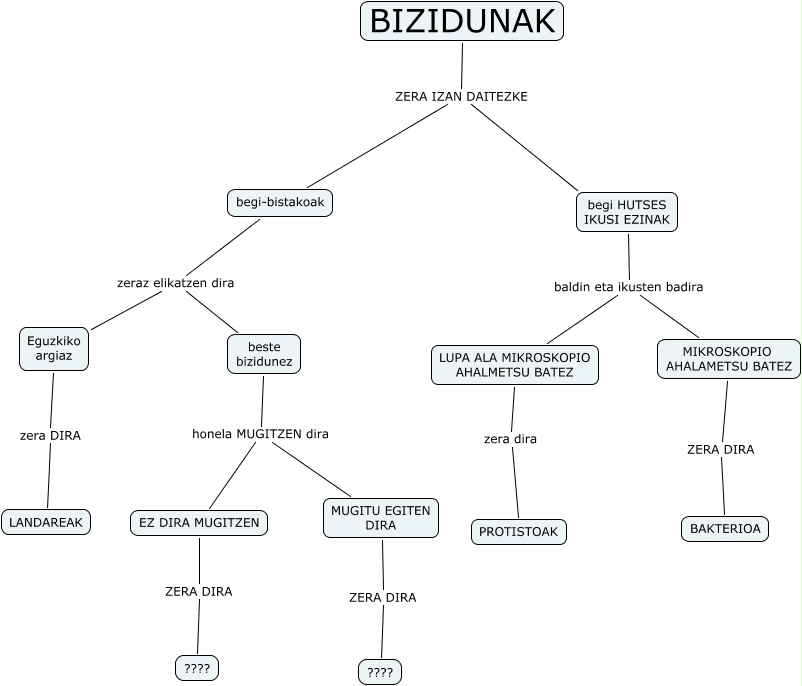 GaLaN, Eguzkiko argiaz zera DIRA LANDAREAK, BIZIDUNAK ZERA IZAN DAITEZKE begi-bistakoak, MIKROSKOPIO AHALAMETSU BATEZ ZERA DIRA BAKTERIOA, MUGITU EGITEN DIRA ZERA DIRA ????, begi-bistakoak zeraz elikatzen dira Eguzkiko argiaz, beste bizidunez honela MUGITZEN dira EZ DIRA MUGITZEN, BIZIDUNAK ZERA IZAN DAITEZKE begi HUTSES IKUSI EZINAK, EZ DIRA MUGITZEN ZERA DIRA ????, begi HUTSES IKUSI EZINAK baldin eta ikusten badira MIKROSKOPIO AHALAMETSU BATEZ, LUPA ALA MIKROSKOPIO AHALMETSU BATEZ zera dira PROTISTOAK