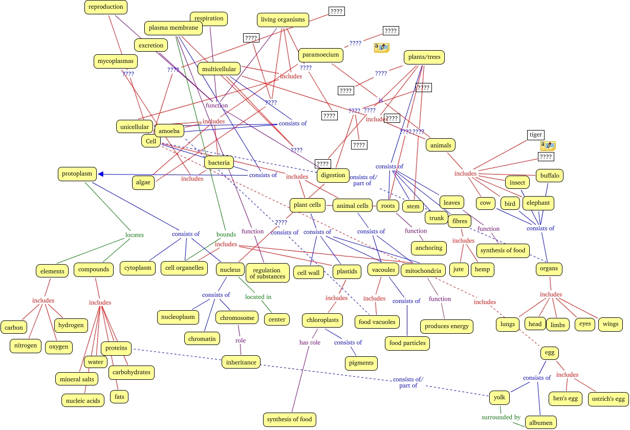This Concept Map has information related to: Cell Structure and Function-collaboration, plants/trees ???? roots, organs includes limbs, bird consists of organs, vacoules consists of food particles, cell organelles includes plastids, Cell ???? ????, elements includes nitrogen, plants/trees consists of leaves, vacoules includes food vacuoles, leaves function synthesis of food
