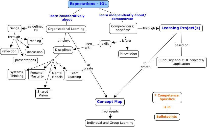 Expectations IOL, Organizational Learning employs Disciplines, skills used with Disciplines, Organizational Learning as defined by Senge, * Competence Specifics is in Bulletpoints, Competence(s) specifics* through Learning Project(s), Senge through reflection, Disciplines of Systems Thinking, Competence(s) specifics* is/are Knowledge, Disciplines of Personal Masterty, Expectations - IOL learn collaboratively about Organizational Learning