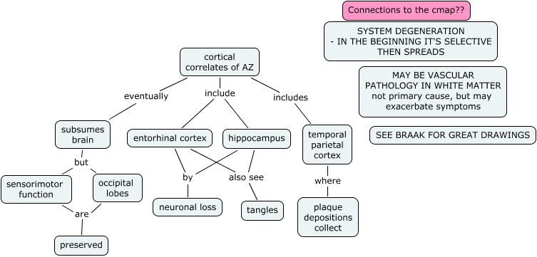 AZ Cortex - JDN Rev, temporal parietal cortex where plaque depositions collect, subsumes brain but occipital lobes, cortical correlates of AZ include entorhinal cortex, entorhinal cortex by neuronal loss, cortical correlates of AZ include hippocampus, cortical correlates of AZ include hippocampus, hippocampus also see tangles, entorhinal cortex also see tangles, cortical correlates of AZ include entorhinal cortex, cortical correlates of AZ eventually subsumes brain