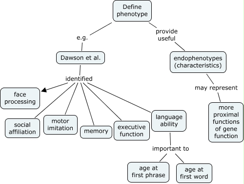 Autism Phenotypes - JDN Rev, Define phenotype e.g. Dawson et al., Dawson et al. identified language ability, endophenotypes (characteristics) may represent more proximal functions of gene function, language ability important to age at first phrase, Dawson et al. identified social affiliation, Dawson et al. identified face processing, Define phenotype provide useful endophenotypes (characteristics), language ability important to age at first word, Dawson et al. identified memory, Dawson et al. identified motor imitation