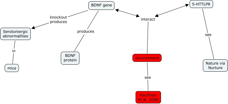 MDD genes, 5-HTTLPR see Nature via Nurture, environment see Kaufman et al. 2006, BDNF gene interact environment, Serotoniergic abnormalities in mice, BDNF gene interact 5-HTTLPR, BDNF gene knockout produces Serotoniergic abnormalities, BDNF gene produces BDNF protein